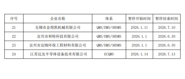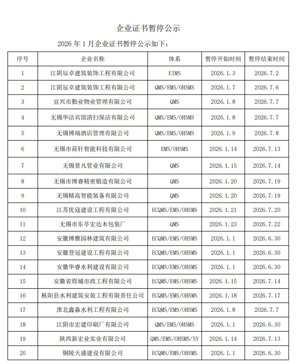 2026年1月企业证书暂停公示