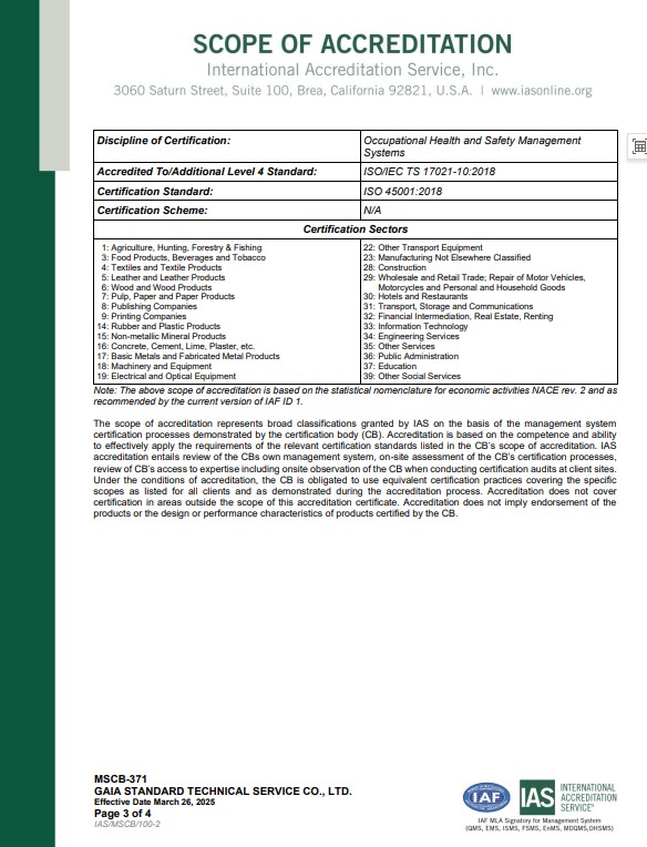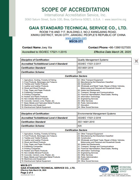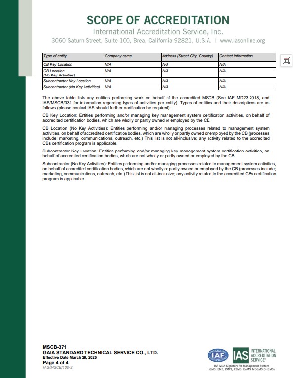 2025年3月26日,公司凭借卓越的实力与深厚的专业沉淀,首次获得国际认可机构IAS批准,并取得IAS颁发的认可证书(证书编号:MSCB-371)。![]()